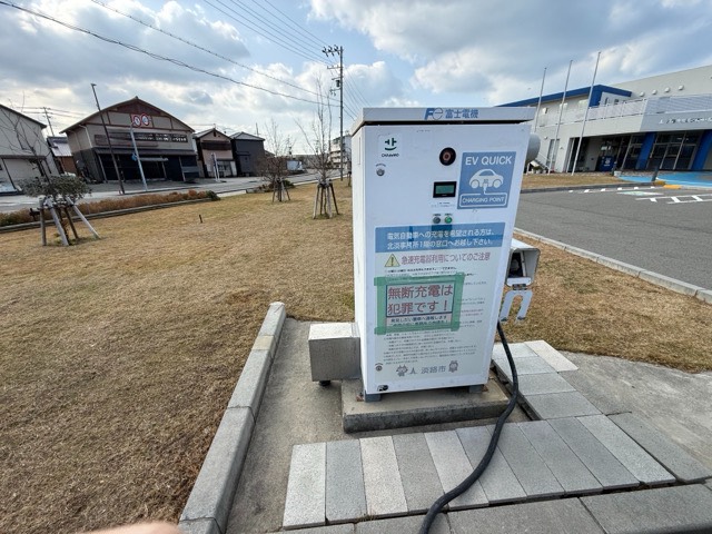 駐車場入って左手にあります。 人気スポットですね。 ただ張り紙が「無断充電は犯罪です!」があります。 きちんと事務所窓口で受付しましょう。 もし充電器が更新されるならばFLASHかPowerXぐらいが希望したいところです。FLASHは上記の張り紙があるような感じですとPowerXのほうが安心のような気がします。