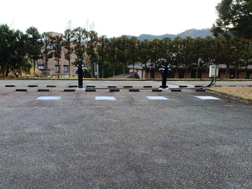 クラブハウスを越えた奥の駐車エリアにあります。 ここは裏面でも充電できそうです。万が一、非充電車が占拠しても、どこかが空いていれば使えそうです。 それでもゴルフ場はコーンがあった方が良いと思います。(稼働前の写真ではあります) ここだけの話ではないですが、充電器の2本の間隔をあと1つでも開けておけばさらに使える車室は増えてくるとは思います。スーパーなど駐車の回転が速い施設では、どこかが空いていると使えるのでそう言う施設では、この充電スポットの感じの設置プラスちょっとした間隔で設置してもらえるとありがたいと感じます。