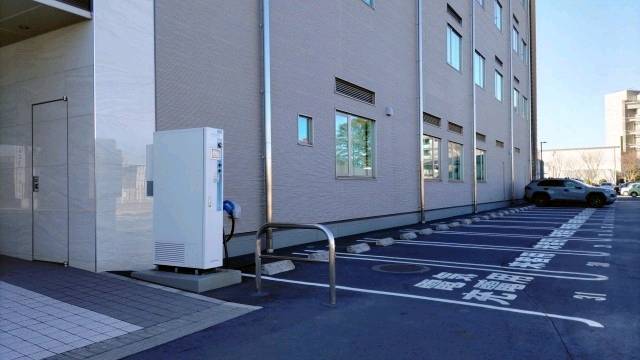 • 市役所駐車場の東側入り口付近に設置されています。 左側が30kW・右側が15kWになります。