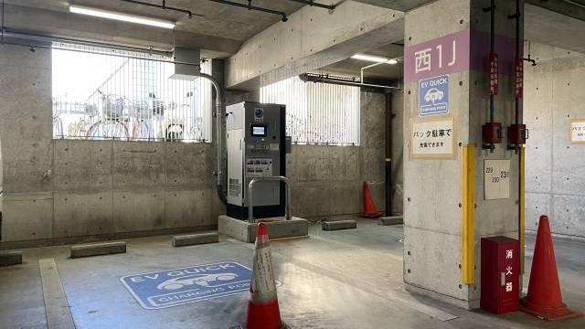 • 駐車場内の目立つ高さにEV Quickの看板があります。 東光高岳製90kW機ですが、合計120kW出力可能な2口タイプのようです。 後方ポートの車種は前面駐車がおすすめです。 フロントのフェンダー付近の車種は届かないことがあると思うので、どちらか左右に制限されそうです。