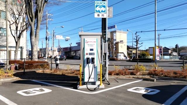 店舗建物から少し離れた駐車場の角にあります。 急速充電器はABB製で操作性も良好、2台同時充電可能です。