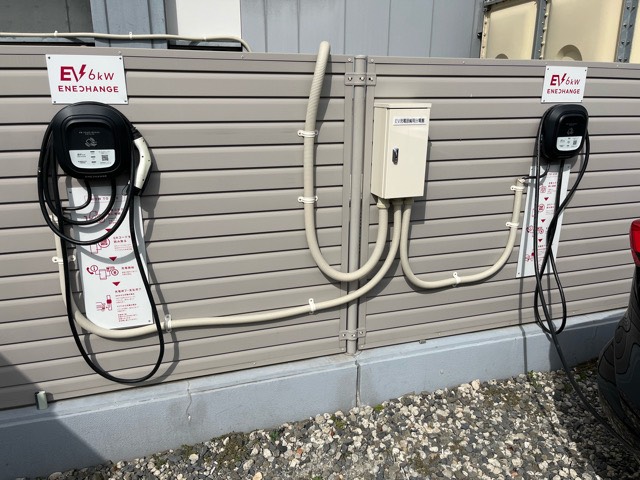 建物裏側にエネチェンジ充電器が1台設置されてます。 カラーコーンが見当たらなかったので非充電車で埋まってしまう事もありそう…
