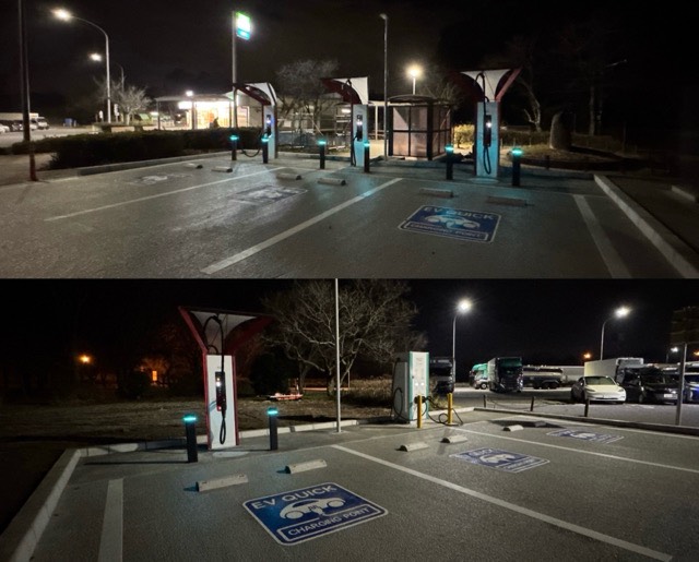 ニチコン製150kWマルチ×4器と(株)東光高岳製150kW×2口器です。ファミリーマート前を出口方向へ走行し左側に設置されています。高出力車は守谷や友部よりこちらが良いですね。