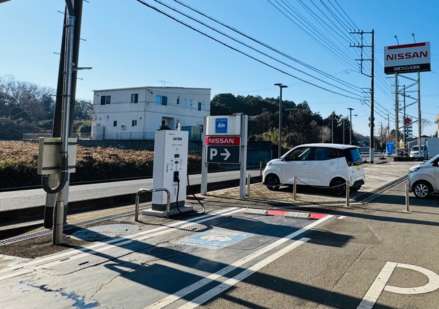 TerraCharge認証 新電元工業(株)90kW×2口器です。販社敷地入りエントランス屋根有りを過ぎ左手に設置されてます。(※写真は店舗裏側から撮りました)