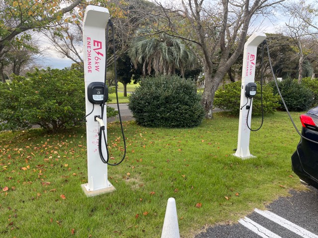 ゴルフ場フロント手前に広い駐車場があり、その一画に2機設置されてなした。半分は屋根付き、半分は屋根なしで、充電機は屋根なしのエリアのほうです。