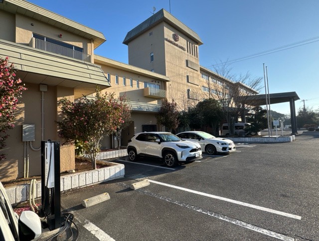 TerraCharge認証日東工業(株)製6kW充電器×2器です。ホテル敷地入り左手、建物前の駐車枠に設置されてます。写真では充電器が1器しか見えませんが建物側にもう1器あります。