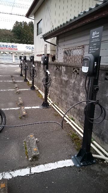 国道から店舗スペースに入場すると左手の壁に5つの普通充電器が設置されています。 そのうち2つが休止中になっていました。