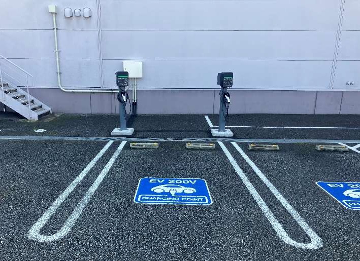 敷地に入って左側の建物前にあります。文書と写真追加 間隔をあけて設置されていますので2台で、充電器で4〜5車室で空いていればどこでも使えそうです。 充電器の間の車室は最後まであけてほしいと思います。