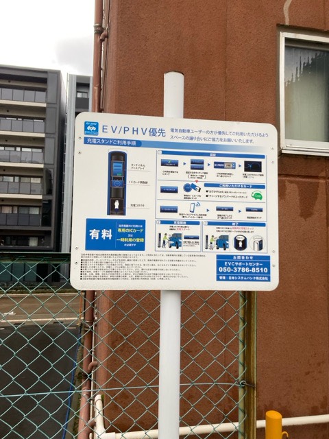 駐車場入って右手前側にあります。4番の後ろにあるので四番が使いやすいですが.3番もコードは届きます。 カード不用、料金不用 駐車場料金 8時〜20時 20分100円 20時〜8時 60分100円 24時間最大 900円