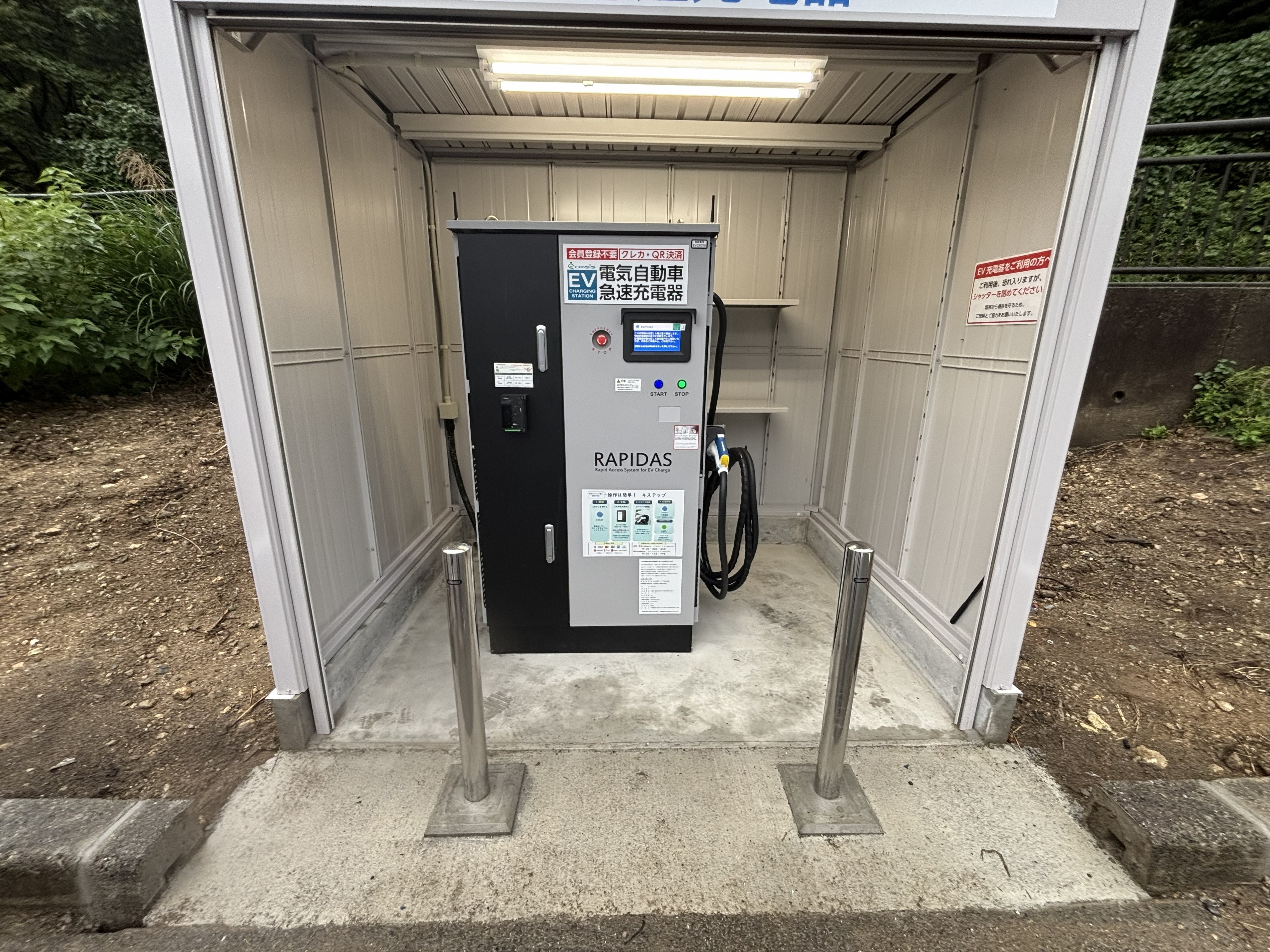 駐車場入ってすぐ左にあります。 受付したらつかえます。 駐車料金無し、他社でも使用可能。 営業時間内のみ使用できます。 eモビリティ系のカードで使用でき設定は1時間、2時間となっています。