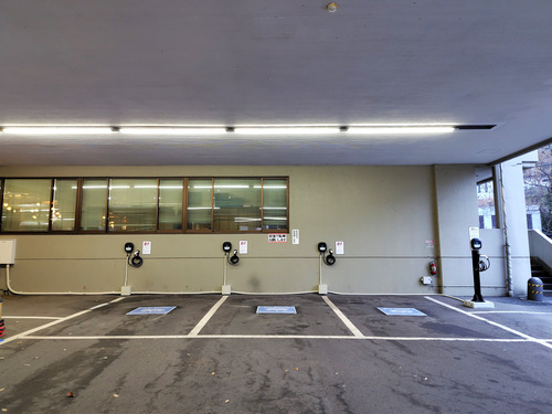 設置場所:駐車場入口ゲートを通った先の突き当り、正面の161,162番の車室にEV充電器があります。 最大出力6kW