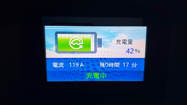 21時に充電を開始しましたが、充電器の冷却音が凄まじいので、一酸化炭素中毒対策でエンジンをかけながら窓を開けて車中泊をされている方の迷惑になりそうなので夜の充電は気を遣うかもしれません。