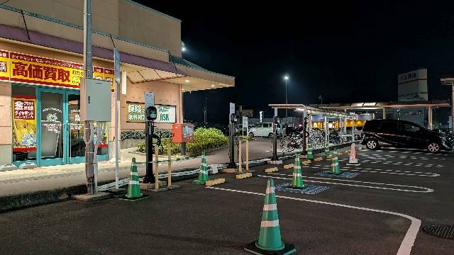 宮脇書店とファミリーマートの間にあります。 充電器は、店舗から離れた県道側なので、停めやすいです。 撮影方向は、南向きです。