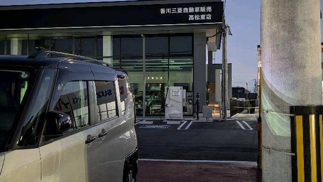 三菱の看板の隣にはスズキアリーナの看板があり、実は同じ1つのお店です。コンセントは奥の整備工場にあります。