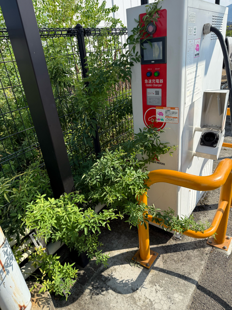 駐車場へ進入した突き当たりにありますが、充電器は道路に対して横向きに建っているので分かりにくいです。