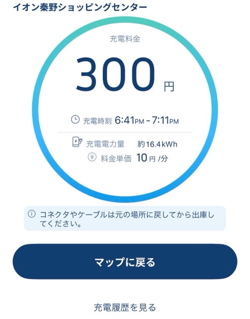 エネパスデビューです。 事前設定(クレジットカードなど)、使い方のシミュレーションをしておいたので簡単にエネパスで充電が開始できました。