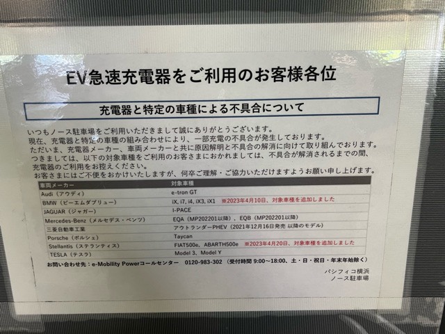 ★オフィシャルサイトより確認★ 現在、一部の急速充電器で特定の車種が充電できないという不具合が発生しております。 対象車種: ・Audi e-tron GT ・JAGUAR I-PACE ・Mercedes-Benz EQA(MP202201以降)、EQB(MP202201以降) ・三菱自動車工業 アウトランダーPHEV(2021年12月16日発売以降のモデル) ・Porsche Taycan ・TESLA Model 3 ・BMW iX、i7、i4、iX1、iX2、iX3、MINI COOPER E、MINI COOPER SE、MINI ACEMAN E、MINI ACEMAN SE、MINI COUNTRYMAN E、MINI COUNTRYMAN SE ALL4 ・FIAT 500e、ABARTH 500e ・Hyundai IONIQ5 不具合解消までの間、上記車種のお客様には充電器のご利用を控えていただきますよう、お願い申し上げます。