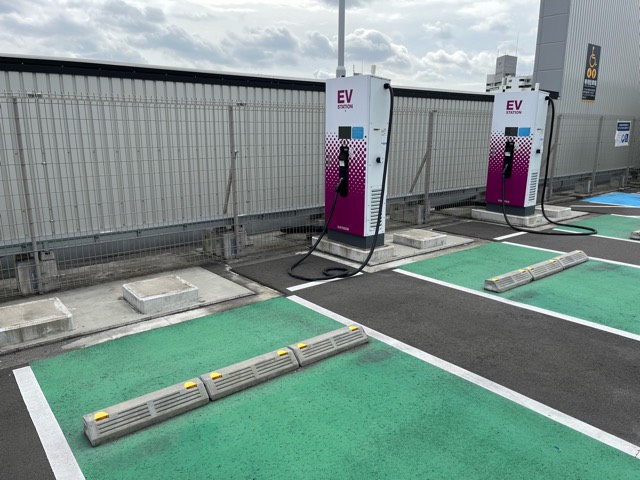 駐車場が地下と屋上に分かれていますが、充電は屋上のみですのでご注意下さい(一度地下に行ってしまうと、一度出庫しないと屋上には行けません)。駐車場入口には充電場所の案内はありません。現在使えるのは急速充電2機のみですが、普通充電のスペースも1台用意されていました(現在は普通充電の機械はまだありませんでしたが、いずれ整備される模様です)。