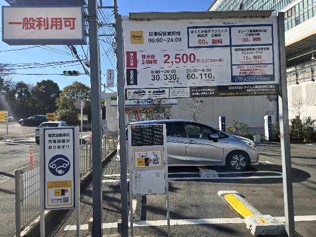 設置場所:入口ゲート右側突き当たり車室 タイムズクラブ パーク&チャージ会員専用。 最大出力6kW