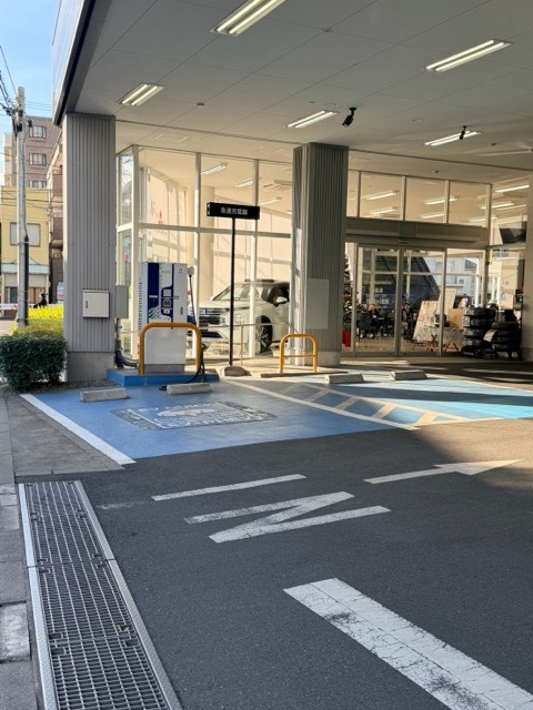 道路に面していて、駐車もしやすくスペースも広いです。充電器はJFE製で、使いやすい。最近の関東三菱自動車はこれですね。