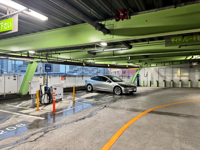 2階の普通充電がタイムズカーシェア専用になっており、その代わりに8階の急速充電の近くに一般用普通充電器が設置されています。 専用枠ではなくガソリン車に止められることも多いと思いますがケーブルが長く、3枠目なら届きそうです。