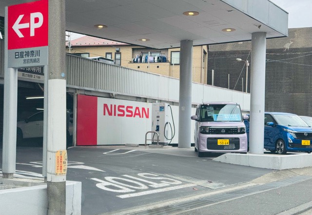 ニチコン製50kW器です。販社敷地入りすぐ右手に設置されてます。ここが使用中でも近くに「日産神奈川販売 宮前平店」があるので安心です。