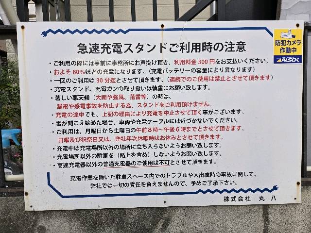 ニチコン製50kW器です。販社敷地入りすぐ右手に設置されてます。転回出来るスペース確保の上、ロープ規制してて嬉しい配慮です。