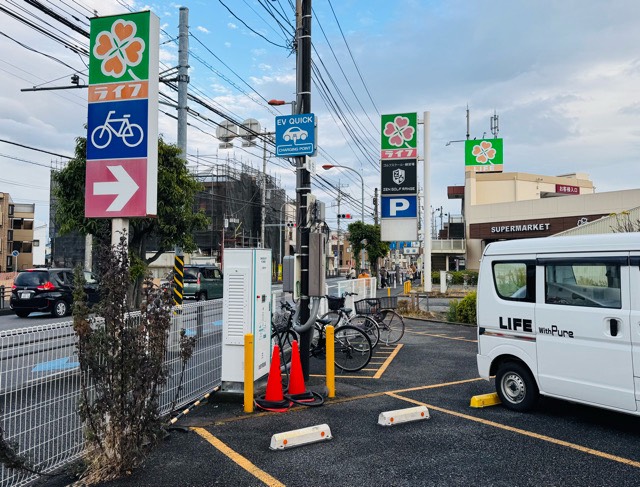 (株)東光高岳製50kW器です。店舗から北里方面(西側)へ50m位進んだ小さめの平面駐車場の通り沿いに設置されてます。営業時間内で使用可能です。