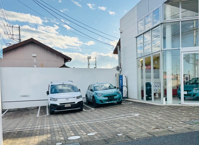 交差点の角側の駐車場、店舗の隅に急速充電器1台あります。