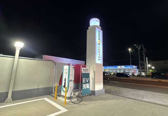 ニチコン製50kW器です。 EneKey、eMP加入カード、nanaco、WAON等で充電出来ます。GSの海寄りの端に設置されてます。 ※2025/5/26(月)午前8時〜午前11時間、休業するとのことです。