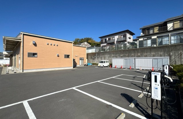 建物右奥(東側)にあるTerra Charge(日東工業(株)製6kW)充電器2器×2口で合計4口です。充電する車両専用枠ではないのでガソリン車の駐車の場合有りです。