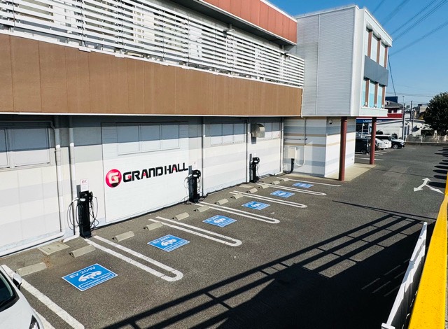 ENECHANGE認証 Zerovo Technologies製6kW充電器×6器です。R467から店舗敷地入り、建物南側の立体駐車場スロープ前に設置されてます。