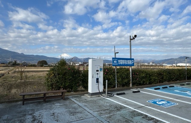 ニチコン製50kW器です。販社敷地入り、真正面の西側に設置されてます。この日はちょっとだけ富士山見えました!営業時間内で使用可能です。