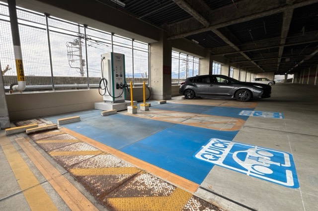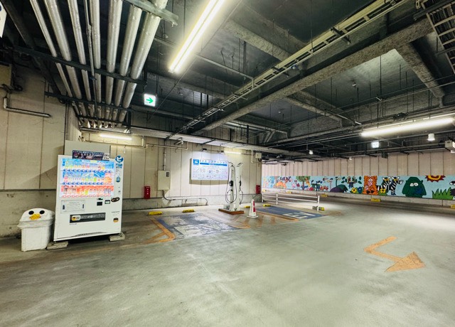 everiwa認証Panasonic製6kW器です。WEST P-5駐車場を左折入庫し、オーバーブリッジの真下、通り沿いに設置されてます。充電料金は330円/hです(2025/12月時点)。