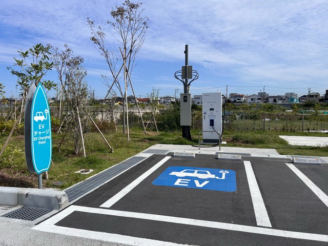 ニチコン製50kw急速充電器が設置されていました。テラチャージ認証でテラチャージアプリまたはビジター充電でクレジットカードやQRコード決済から利用できます。利用料金は、1分38.5円です。施設から一番離れた柳島スポーツ公園側に設置されていました。2箇所の入り口がありますが、伺った時はお盆期間中ということもあり非常に混雑していたので国道沿いからしか入場できませんでした。
