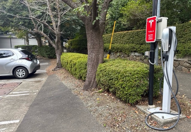 テスラの充電器です。駐車場にスタッフが居るのでお声がけ必要です。テスラ看板支柱にPanasonic製200Vコンセントも付いてました。充電ケーブルがあれば使えるかもです。