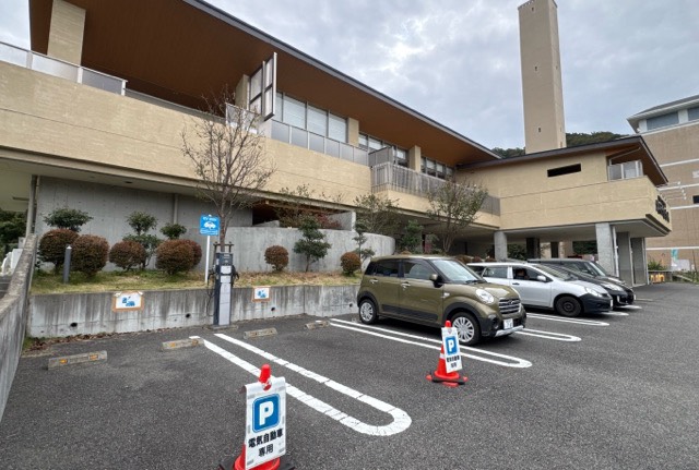 Panasonic製4kW×2口普通充電器です。施設駐車場入り左手奥、建物前に設置されてます。フロントで声掛けし、開錠してもらい充電します。充電無料、駐車場は有料です。コーンが設置され「電気自動車専用」との案内となってます。