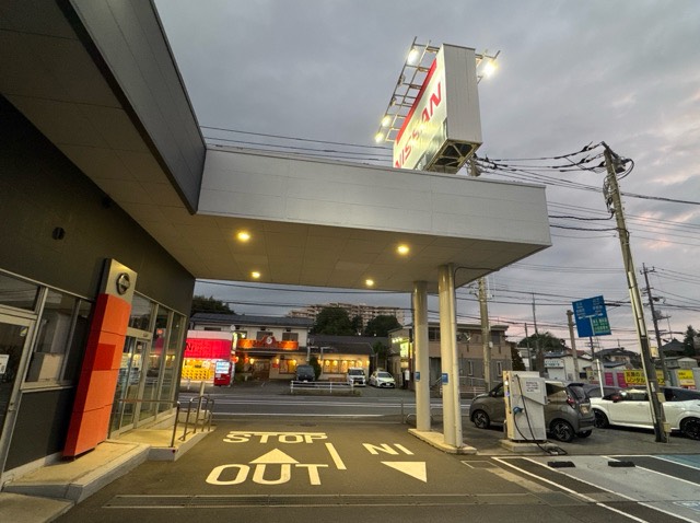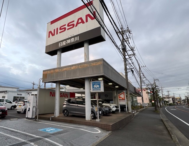 ニチコン製50kW急速充電器です。販社敷地南側、通り沿いに設置されてます。大きなNISSAN看板下です。充電エリアは広くないので転回時要注意です。