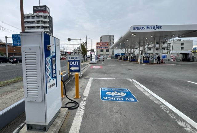 ニチコン製50kW器です。EneKey、eMP加入カード、nanaco、WAON等で充電出来ます。R412バイパスからGS入りすぐ左手に設置されてます。