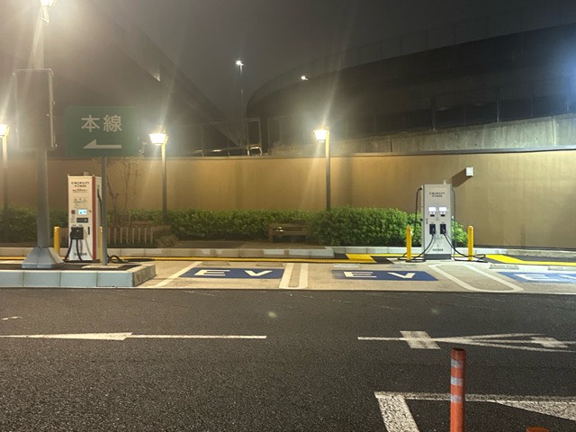 ABB製150kW×2口器とニチコン製90kW×2口器です。PAへの誘導路を降り、すぐ右手に進み突き当たり(南側)に設置されてます。夜中は誘導路に路駐してる大型車両が多く要注意です。