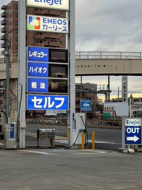 ガソリンの値段書かれた電光掲示板の真下に1台急速充電器あります。
