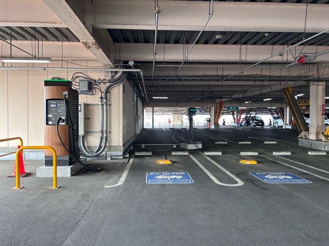 新電元工業(株)製50kw急速充電器①とモリテックスチール(株)製6kW普通充電器②です。アプリから1時間予約出来ます(但し、予約して使わないとキャンセル料取られます)。3F立体駐車場出口近くに設置されてます。