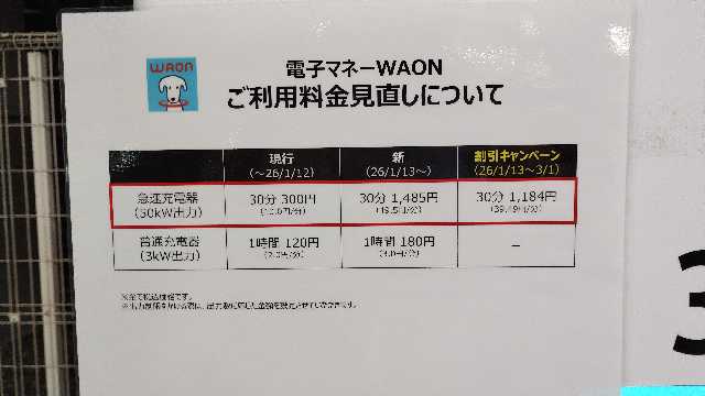 ニチコン製50kW×2器とPanasonic製4kW×8器(うち1器故障中)です。急速充電器も普通充電器もWAONで充電がお得です。スロープ下なので雨の日濡れなくて良いですね!