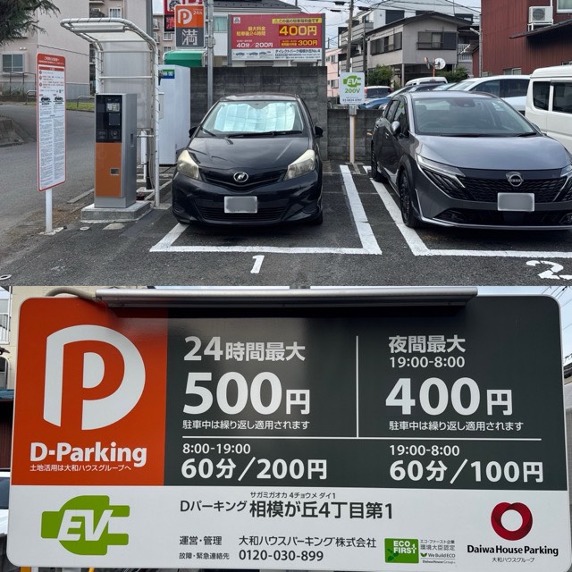 座間大和線近くのDパーキング相模が丘4丁目第1に設置されてます普通充電器(コンセント)です。