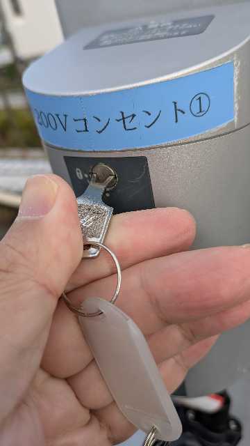 EKクロスEVで利用 フロントで200Vコンセントの鍵を借りるのだが、夜は鍵穴がどこにあるのか分からず苦戦 写真の位置にあります。