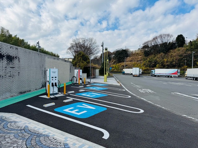 ABB製150kW×2口器(奥)とニチコン製90kW×2口器(手前)の計4台分の充電が可能です。PA敷地出口付近に設置されてます。