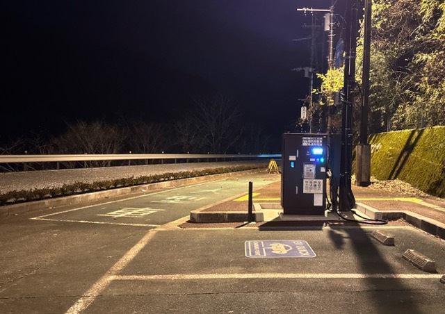 JFEテクノス製50kW器です。道の駅駐車場に入り左手奥に設置されてます。充電カード不要、各種クレジットカードやQRコード決済などで決済する従量課金制です。