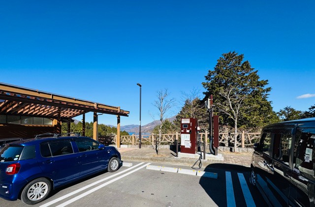 Panasonic製4kW普通充電器です。建物西側、芦ノ湖側に設置されてます。道の駅売店で受付し鍵を受け取り充電します。
