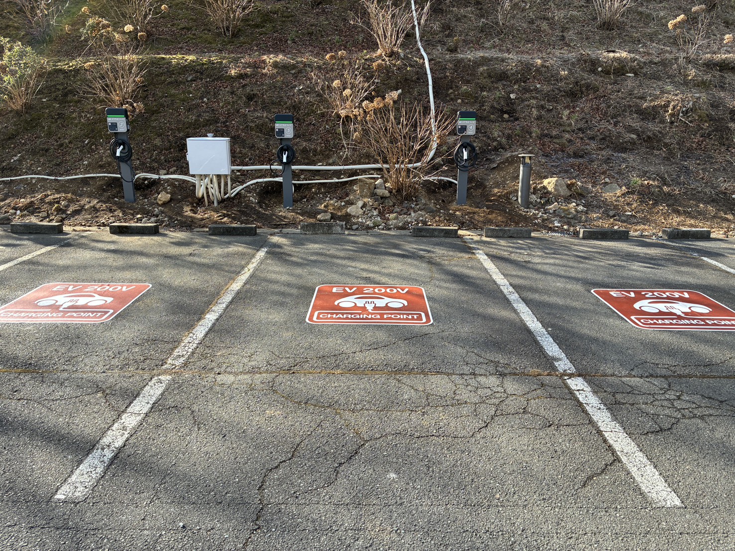 設置場所:県道75号線沿いの入り口より道なりに進み、右側駐車スペースの植木沿いの車室にEV充電器があります。 どなたでもご利用可能です。 最大出力6kW
