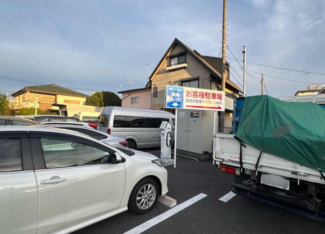 トヨタメディアサービス(株)製3.2kW普通充電器です。販社敷地入り右手奥、お客様駐車枠に設置されてます。営業時間内で使用可能です。